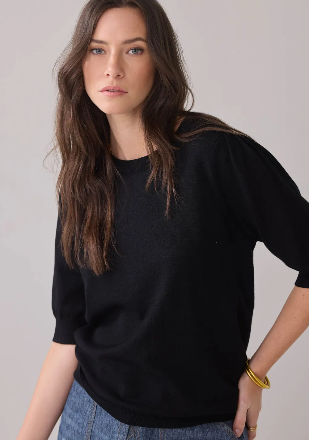 – Het model is 1.76m lang en draagt maat S