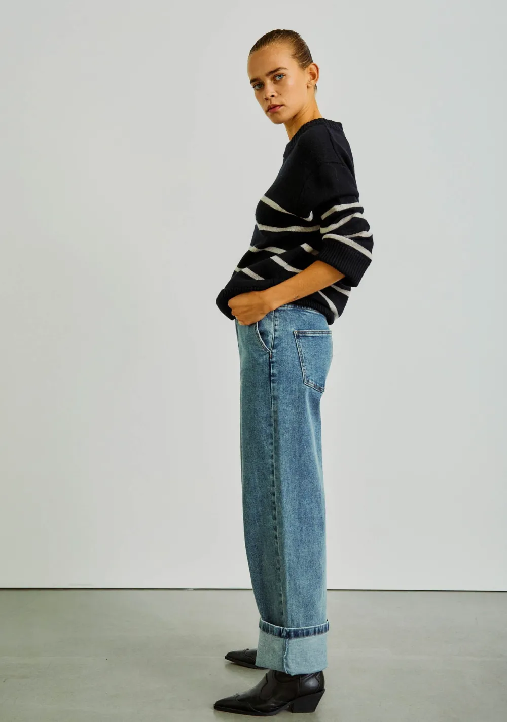 – Het model is 1.76m lang en draagt maat S
