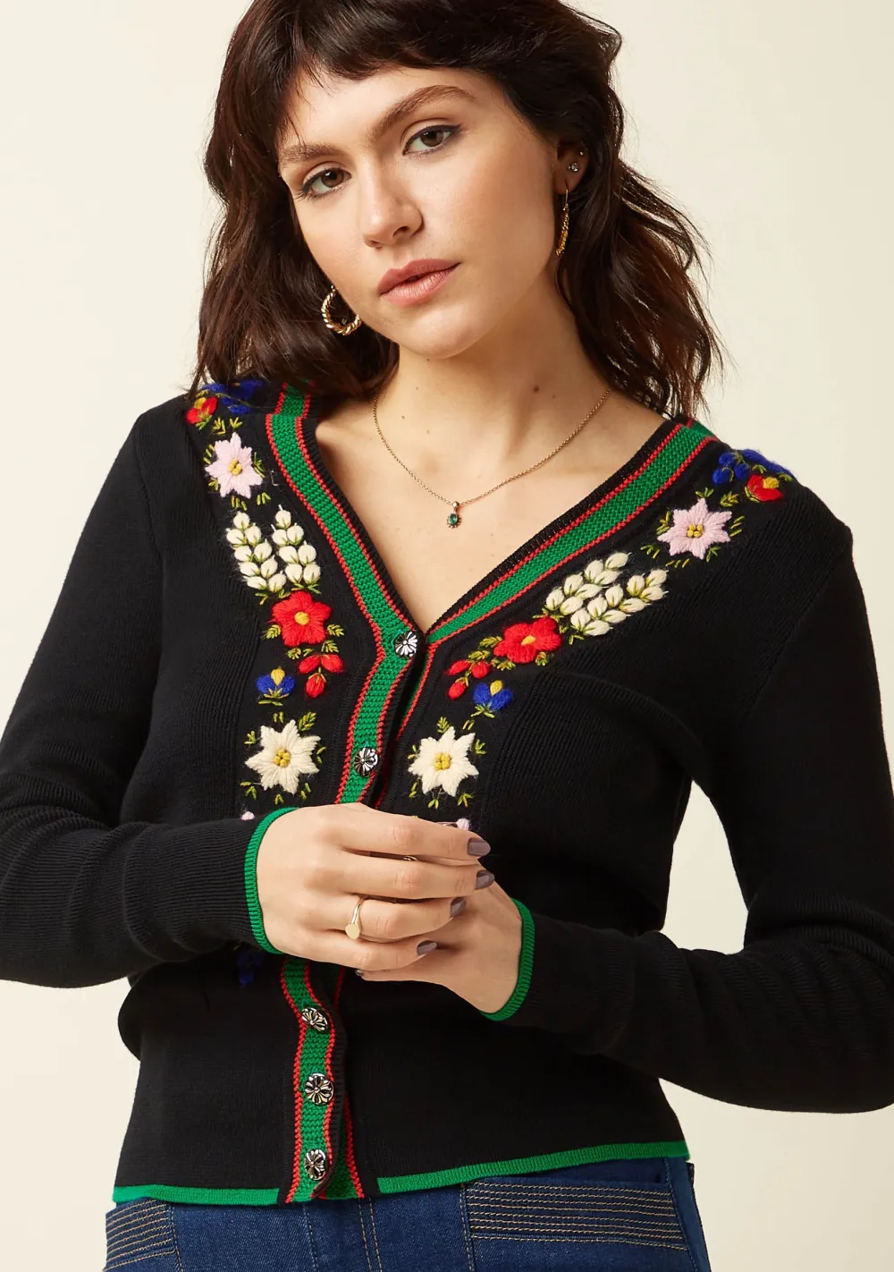 – Het model is 1.65m lang en draagt maat S