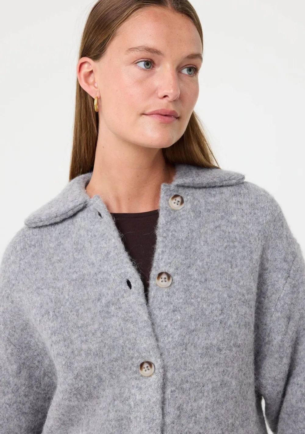 – Het model is 1.76m lang en draagt maat S