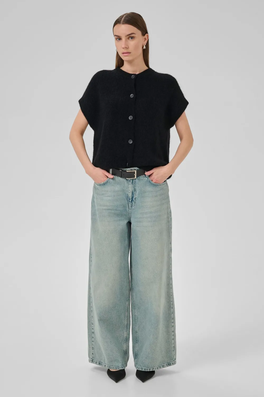 – Het model is 1.76m lang en draagt maat S